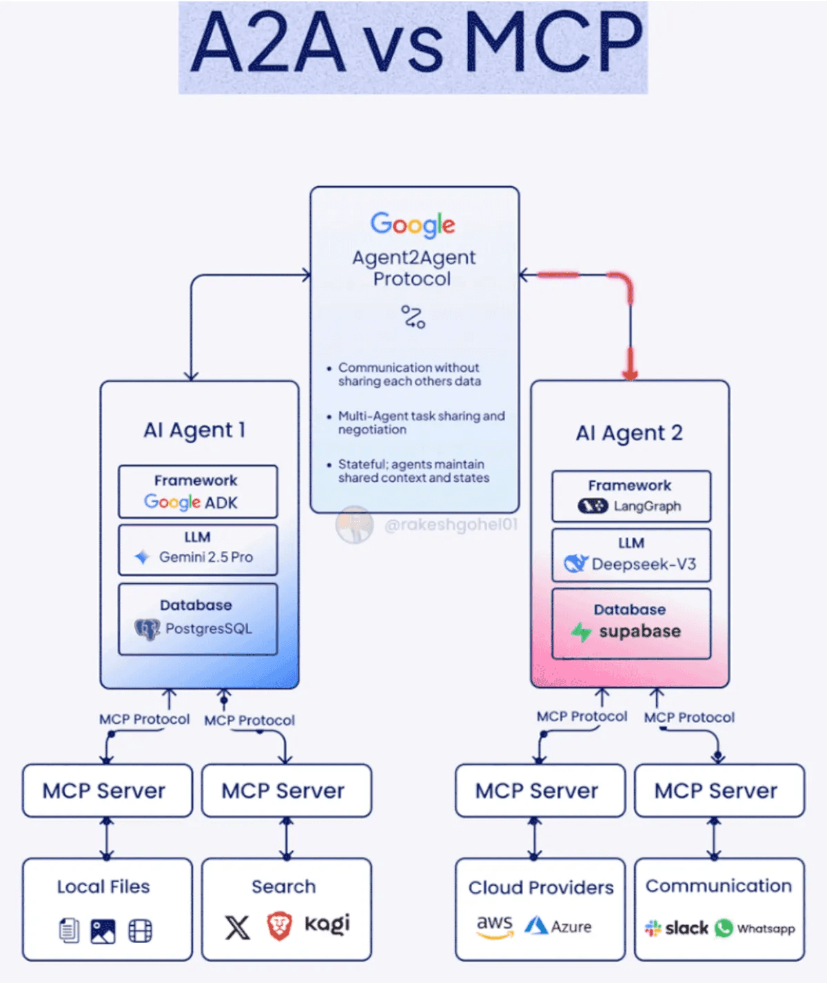 Rather than competing alternatives, MCP and A2A are complementary technologies that can be used together: