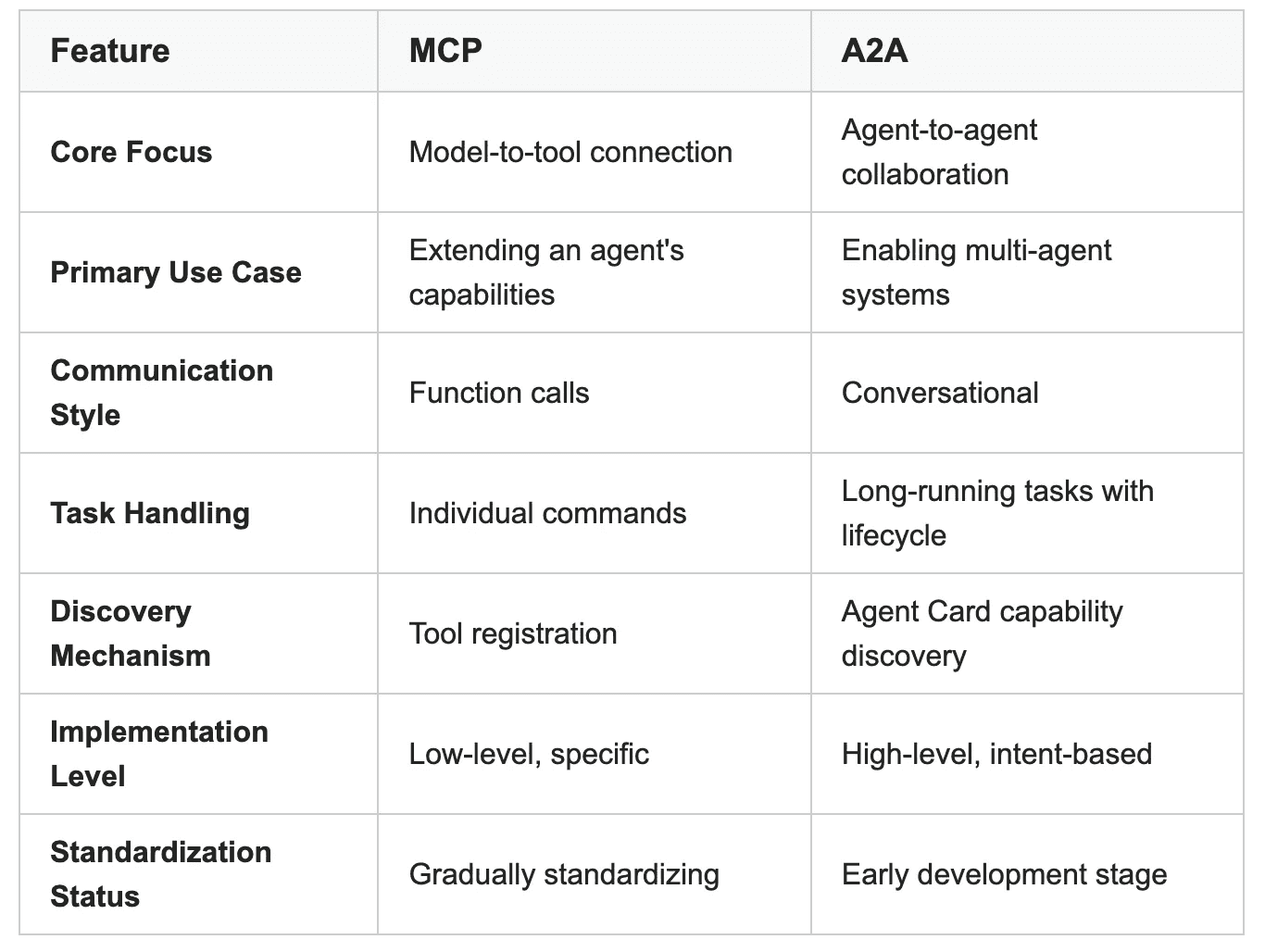 A2A focuses on enabling collaboration between multiple agents. It’s about coordinating distributed agent ecosystems.